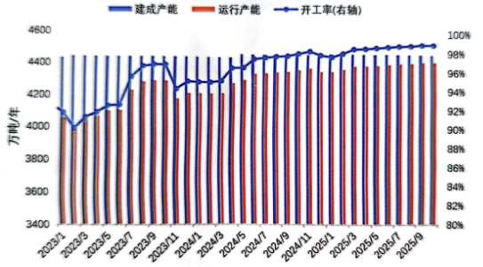2025年10月,國內電解鋁生產(chǎn)能力保持高位持穩(wěn)。截至10月底建成產(chǎn)能4470萬噸/年,運行產(chǎn)能4420萬噸/年,與上月基本持平。未來兩個月,隨著扎鋁二期35萬噸/年建成,預計2025年底建成產(chǎn)能將達到4505萬噸/年。在產(chǎn)能幾近“天花板”,開工率始終維持98%以上背景下,無論是產(chǎn)能還是產(chǎn)量的增長空間都極為有限。