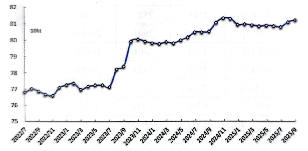 經(jīng)調整,9月份產(chǎn)量為364.4萬噸;預計10月份產(chǎn)量為377.0萬噸,同比增長1.3%,日均產(chǎn)量約12.16萬噸。